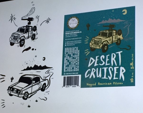 A slide from the panel discussion "Art on Beer" showing a sketch and the finished label design for Round Guys Brewing Co.'s Desert Cruiser.