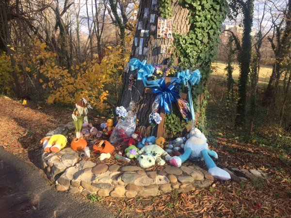 A memorial surrounds a large tulip poplar tree near where the body of toddler Brendan Creato was found in Cooper River Park in Haddon Township in October 2015. Most of the memorial items had been removed by April 17 in preparation for a possible visit by the jury hearing the David "DJ" Creato's murder trial.