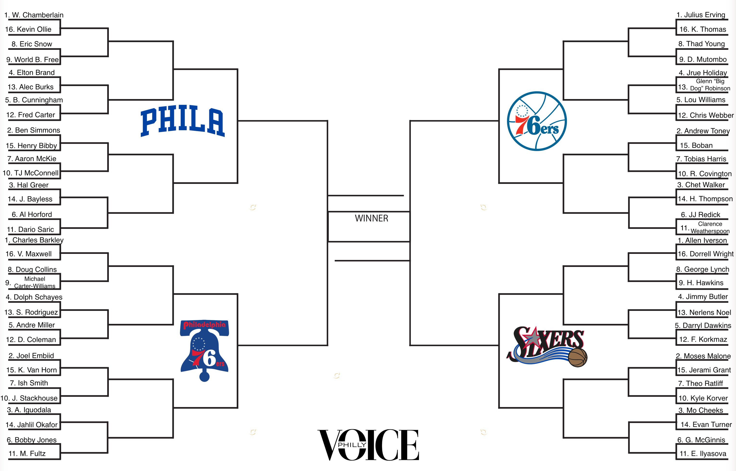 These aren't the "best" 64 players, necessarily, but 64 players from an assortment of eras and categories that I initially was going to divide by playstyles (playmakers, scorers, finishers, and potpourri), before realizing you could put four or five of the greatest players in franchise history into the "scorer" category. I tried to account for some combination of impact, longevity, peak value, etc., with the first goal to split up the players I would consider to be the Sixers' version of Mt. Rushmore — Wilt Chamberlain, Julius Erving, Allen Iverson, and Charles Barkley. Critically, the players were not strictly seeded based on how good they would be in a one-on-one setting.