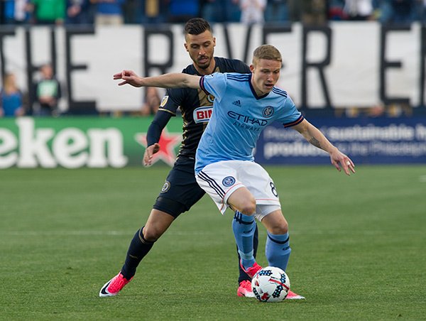New York City's Alexander Ring battles with Union midfielder Haris Medunjanin during an April matchup in Philadelphia.